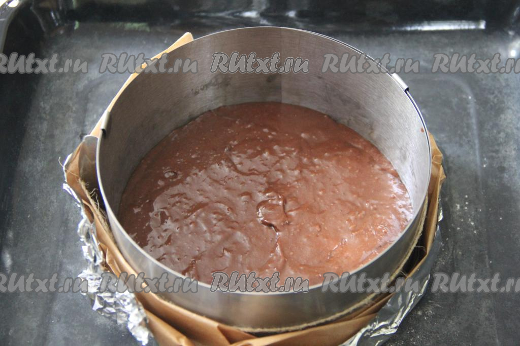 Я использовала кольцо для выпечки без дна диаметром 17 сантиметров, дно формы предварительно сформировала из пергамента и фольги, затем установила кольцо на противень. Можно взять обычную разъёмную форму для выпечки и дно застелить пергаментом.