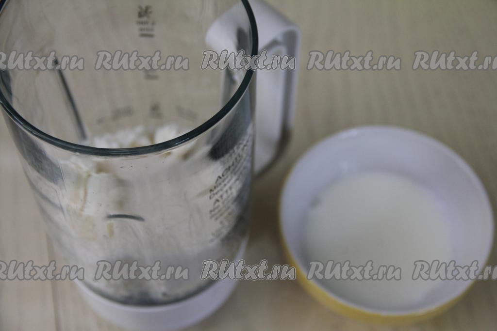 Теперь подготовим начинку, для этого в холодное молоко нужно всыпать желатин, перемешать до однородности и оставить набухать на 15-20 минут. Поместить творог и сахар в чашу погружного блендера, пробить погружным блендером до однородности.