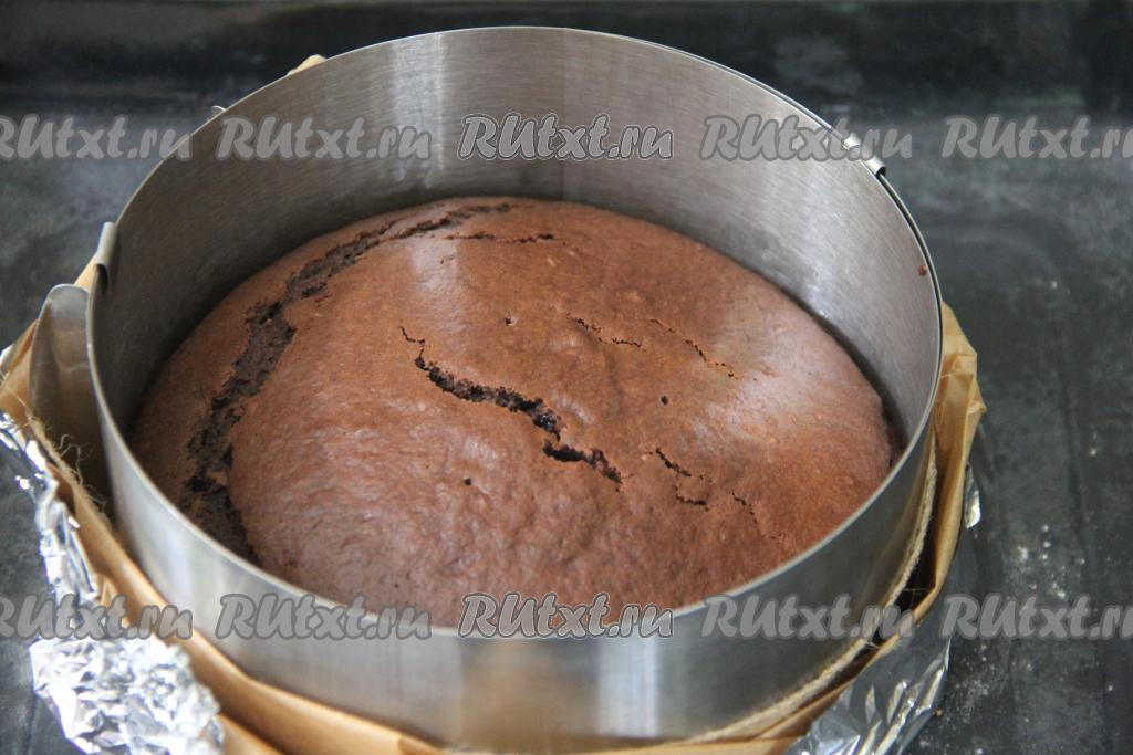 Поставить противень с формой в духовку, разогретую до 180 градусов, выпекать бисквитный корж минут 30 минут. Для того чтобы проверить готовность, проколите корж сверху сухой зубочисткой, если после прокалывания на зубочистке не останется следов теста, значит нужно доставать выпечку из духовки.