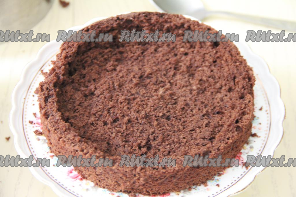 Готовый бисквитный корж достать из духовки, немного остудить, вынуть из формы, переложить на решётку и оставить до полного остывания. Срезать верхушку у коржа (подровнять). А затем аккуратно достать бисквит из серединки коржа, сформировав тарелочку с бортиком, как на фото.