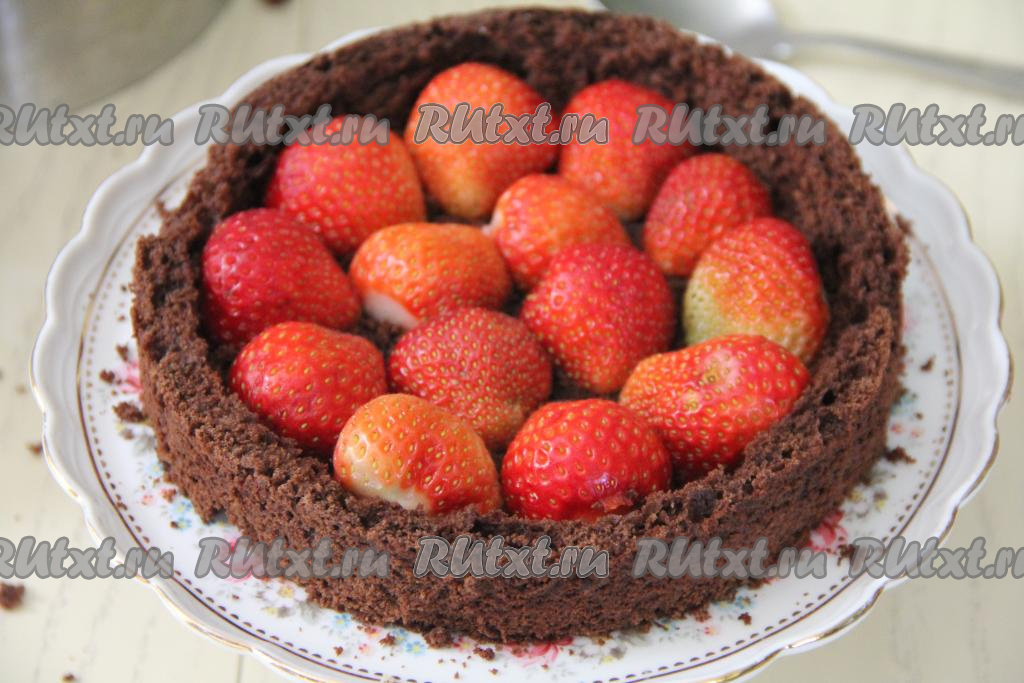 Клубнику очистить от чашелистиков, промыть ягоды водой и обсушить. В форму, которую мы сформировали из коржа, выложить подготовленную клубнику.