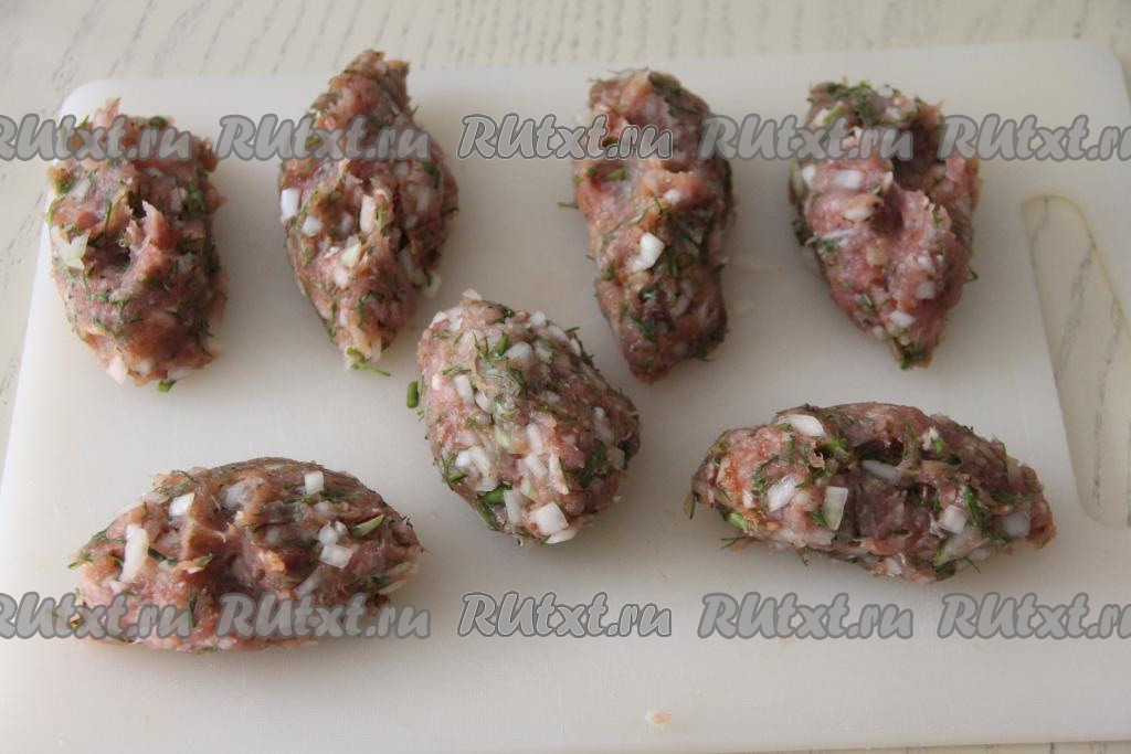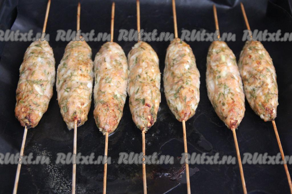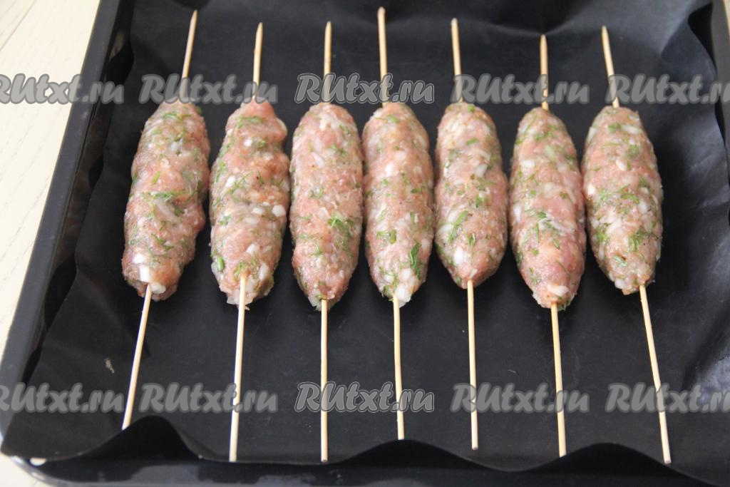 Сформировать люля-кебабы на шпажках. Чтобы фарш не прилипал к рукам в процессе формирования, смочите ладони водой. Выложить заготовки люля на противень, застеленный ковриком (или пергаментом) для выпечки.
