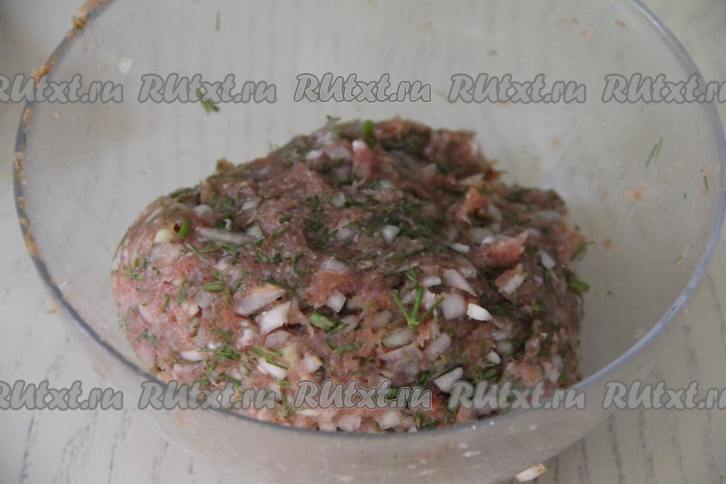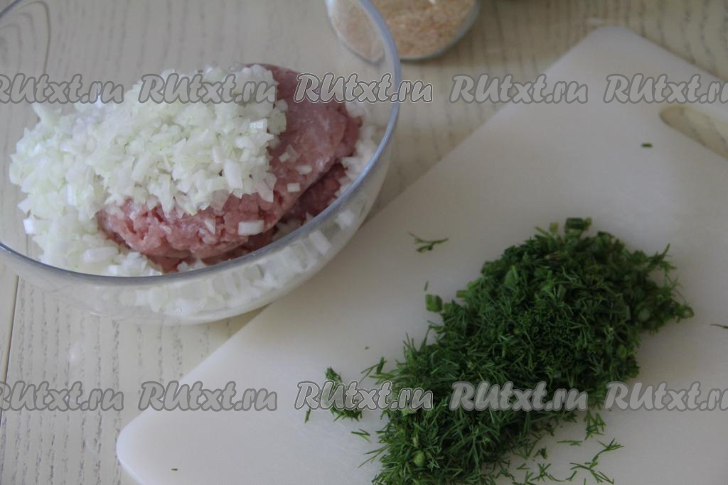 Лук и укроп мелко нарезать. В миске соединить фарш и лук.