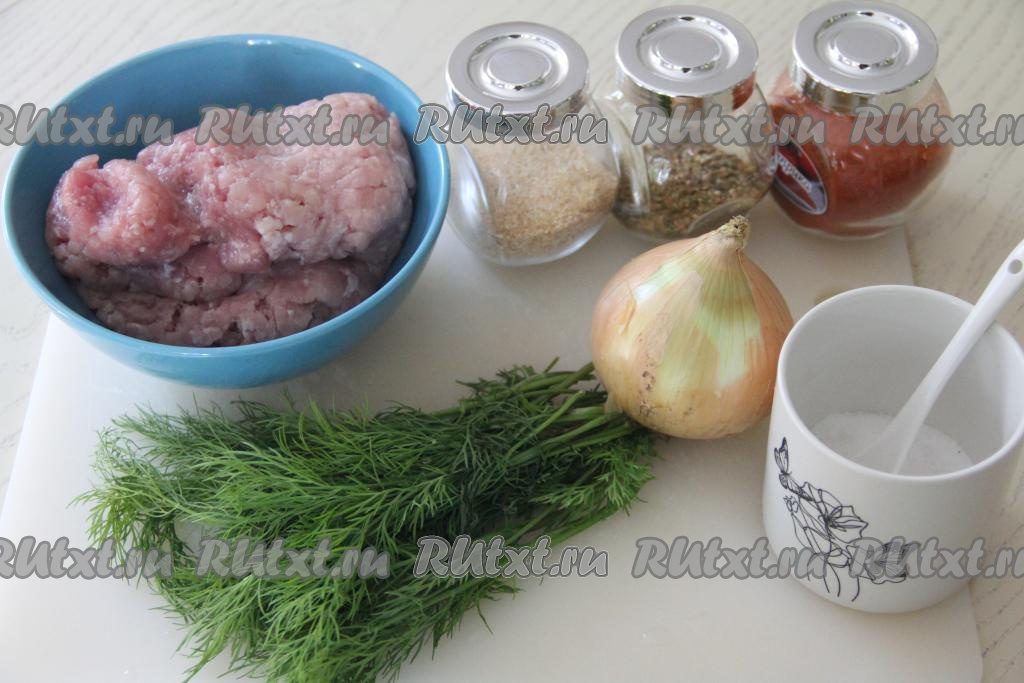 Подготовить продукты. Фарш можно взять любой, но особенно вкусными получаются люля-кебабы из свиного фарша. Очистить луковицу. Укроп промыть водой и обсушить.