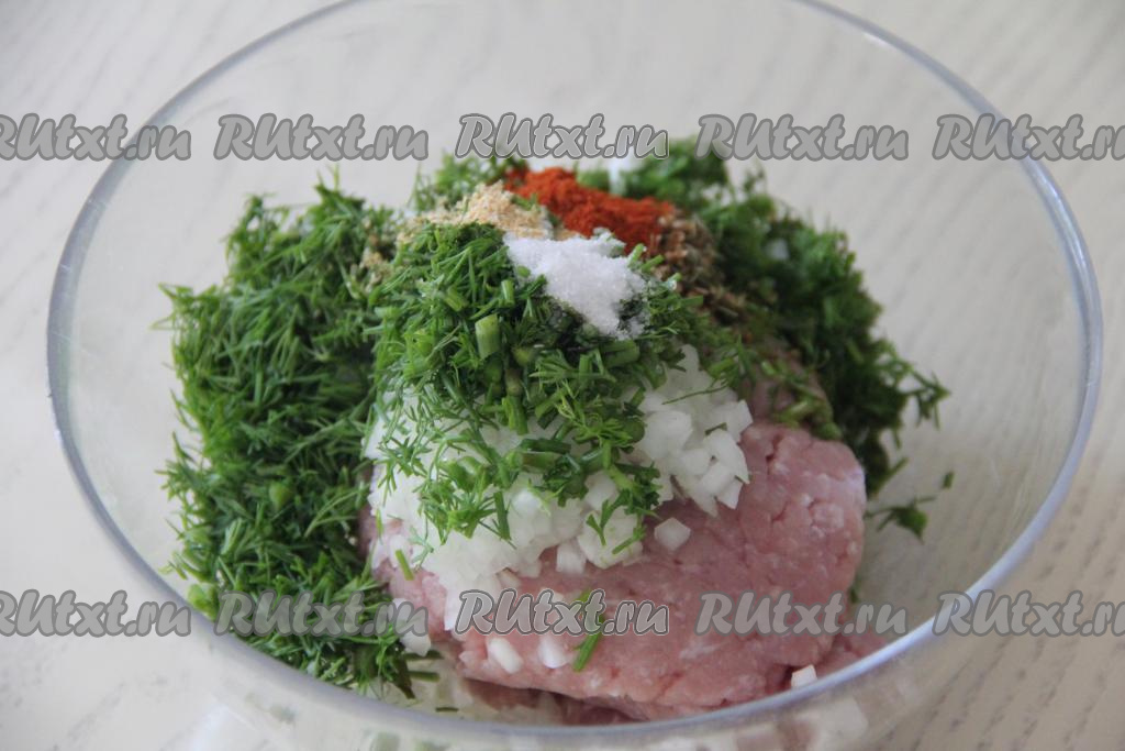 К фаршу с луком добавить укроп, соль и специи (в качестве специй я использовала паприку и сушёный чеснок).
