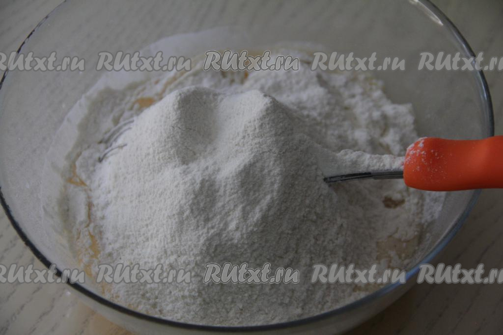Соду погасить уксусом (или лимонным соком) и влить в миску с яичной смесью, добавить воду комнатной температуры и ещё раз перемешать венчиком.