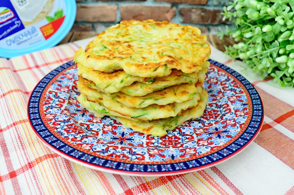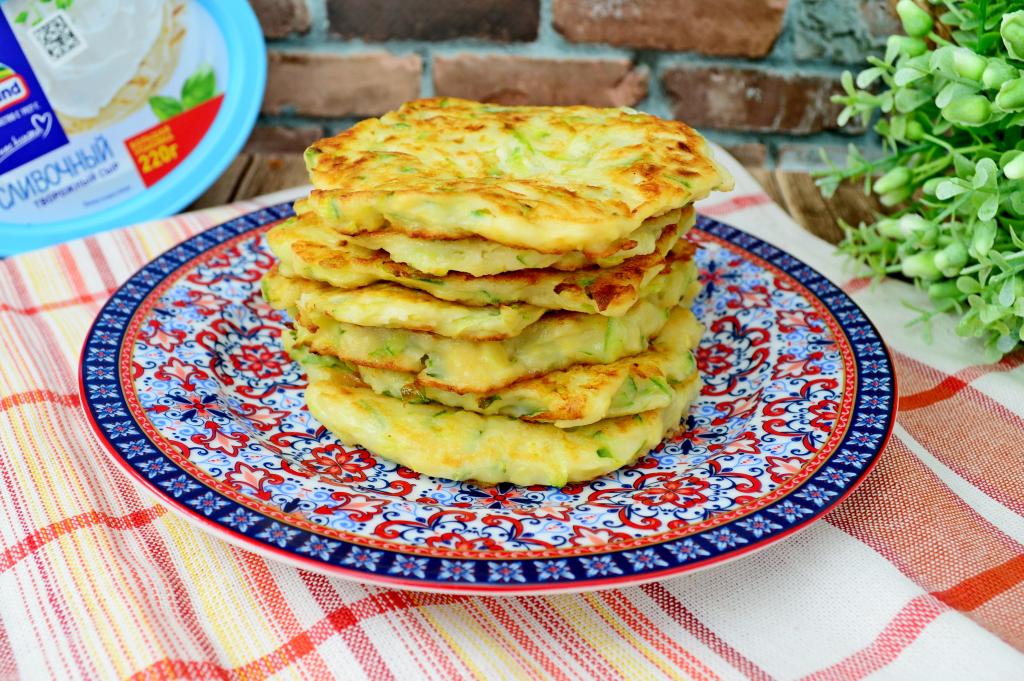 Вкусные, аппетитные, нежные кабачковые оладьи, приготовленные с творожным сыром, можно есть и тёплыми, и полностью остывшими, дополнив, по желанию, сметаной или любимым соусом.
