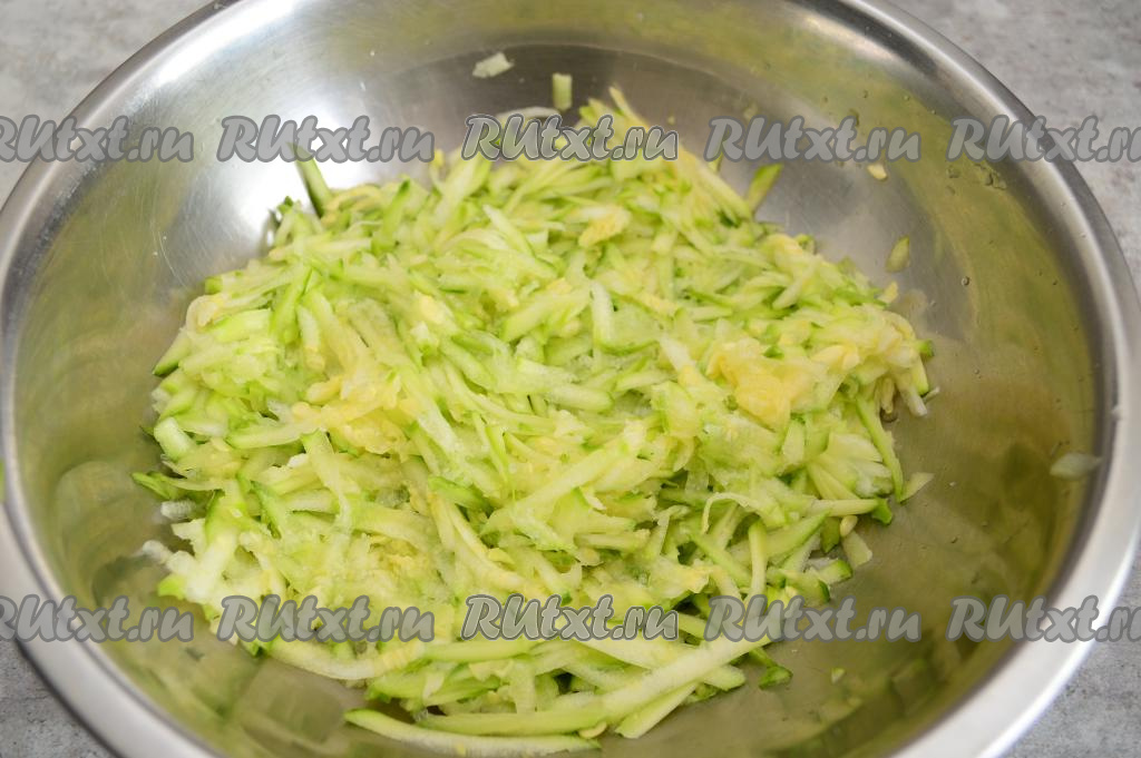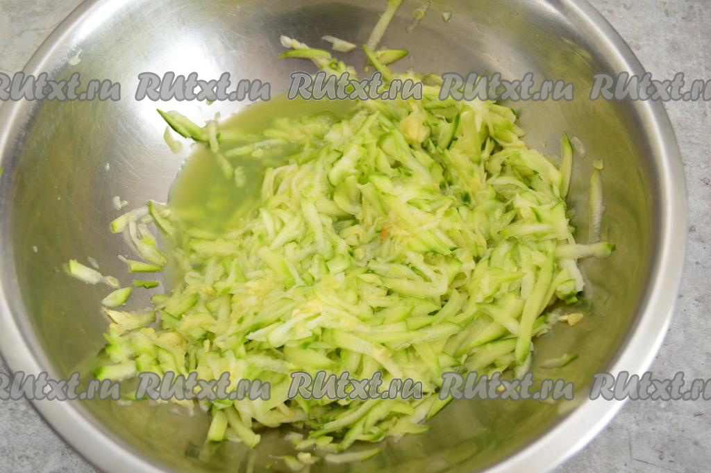 Кабачок очистить от кожуры. 500 грамм подготовленного кабачка натереть на крупной тёрке в миску, сразу всыпать 2 щепотки соли, перемешать и оставить на 5-7 минут.
