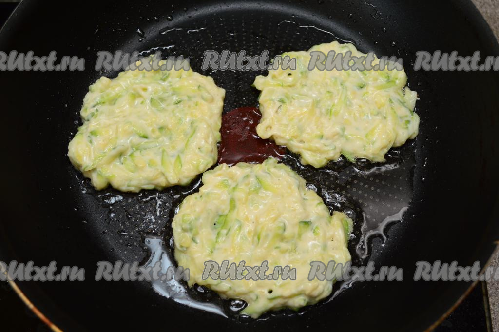 Сковороду хорошо разогреть с растительным маслом. Выкладывать на сковороду по 1 столовой ложке с горкой кабачково-сырного теста, формируя круглый оладушек.