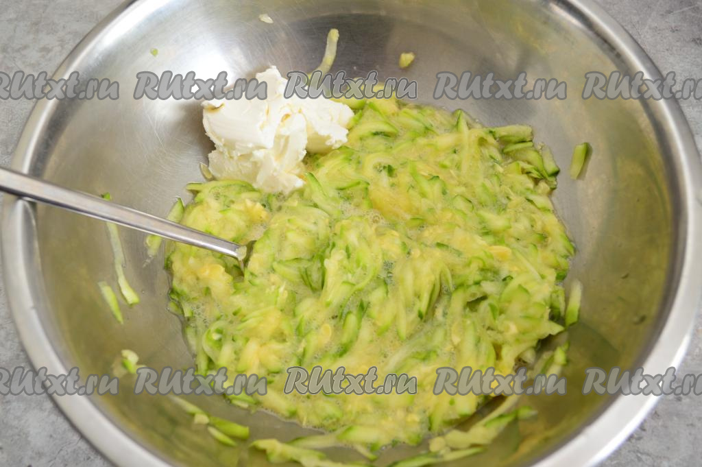 Смешать натёртый кабачок и яйцо до однородности вилкой (или лопаткой). Добавить творожный сыр. Так как творожный сыр тоже солёный, то соли я больше не добавляю.