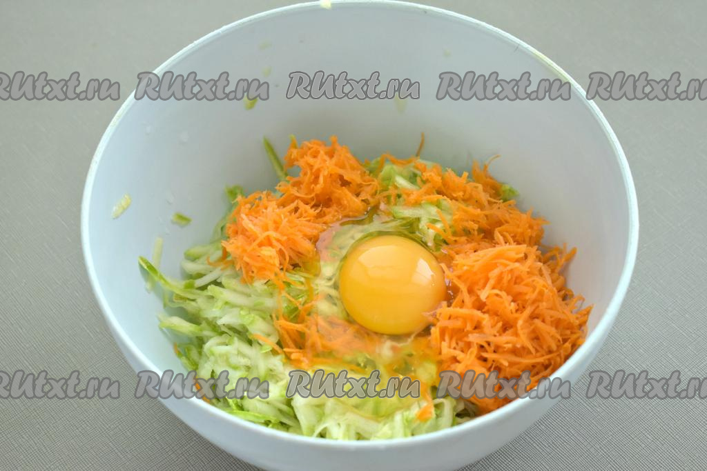 К кабачкам и моркови разбиваем куриное яйцо.