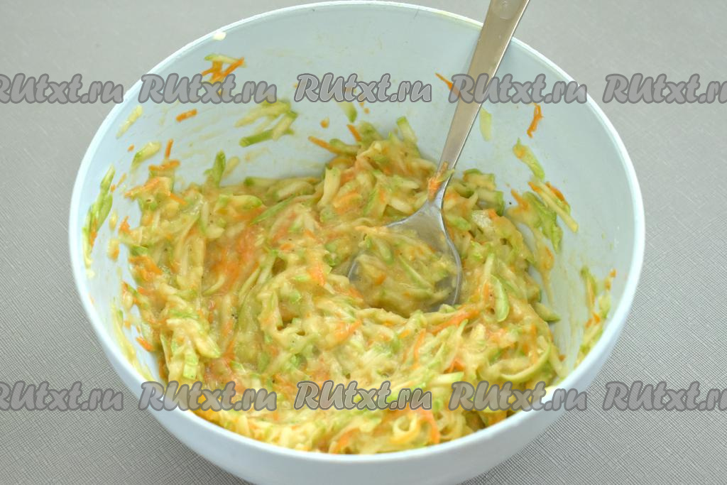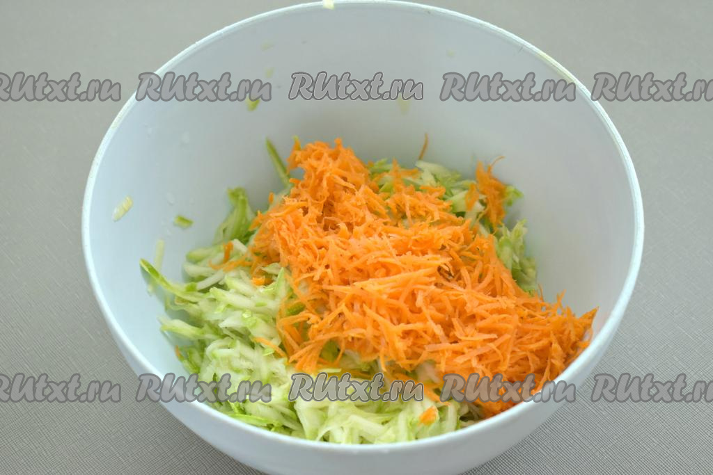 Морковку натираем на мелкой тёрке и добавляем к кабачковой массе.