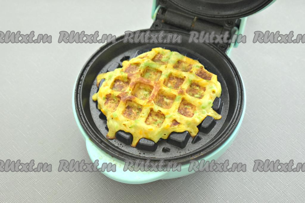 Тесто для вафель из кабачков и моркови должно получиться вязким, средней густоты. Если тесто получилось жидковатым, тогда всыпьте ещё 1 столовую ложку муки.