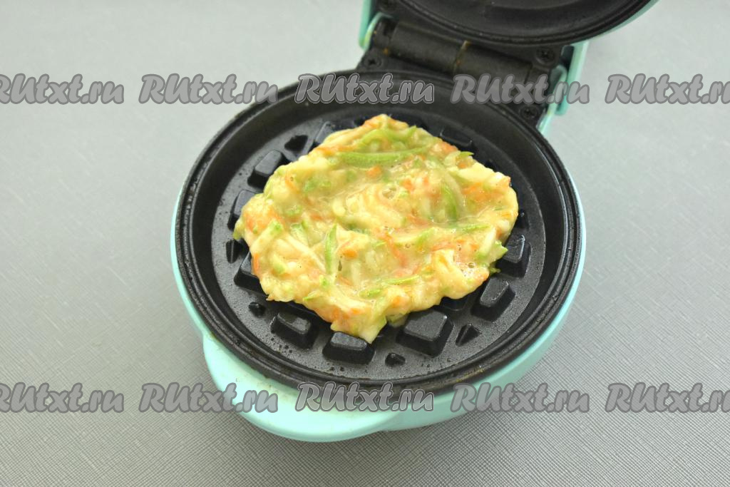 Панели электровафельницы смазываем растительным маслом и разогреваем. В центр нижней панели выкладываем 1 полную столовую ложку кабачково-морковного теста.