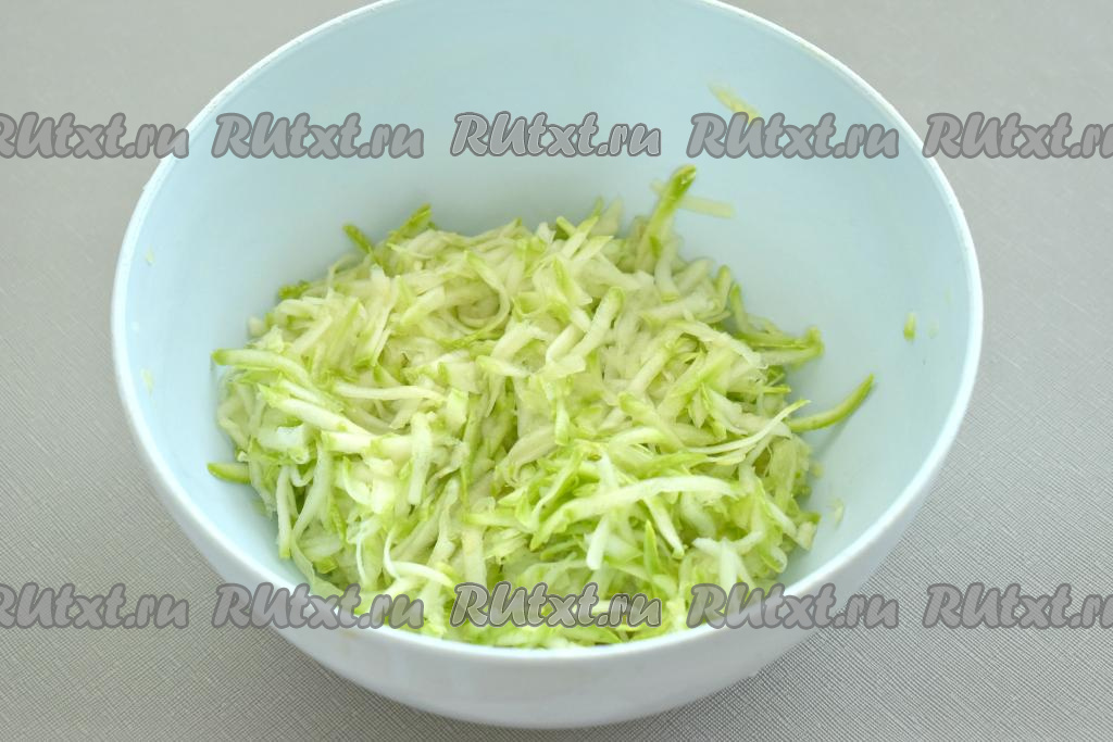 300 грамм подготовленного кабачка натираем на крупной тёрке. Получившуюся кабачковую массу хорошо отжимаем руками, убирая лишний сок (этот сок нам не понадобится). Перекладываем кабачковую массу, отжатую от сока, в объёмную миску.