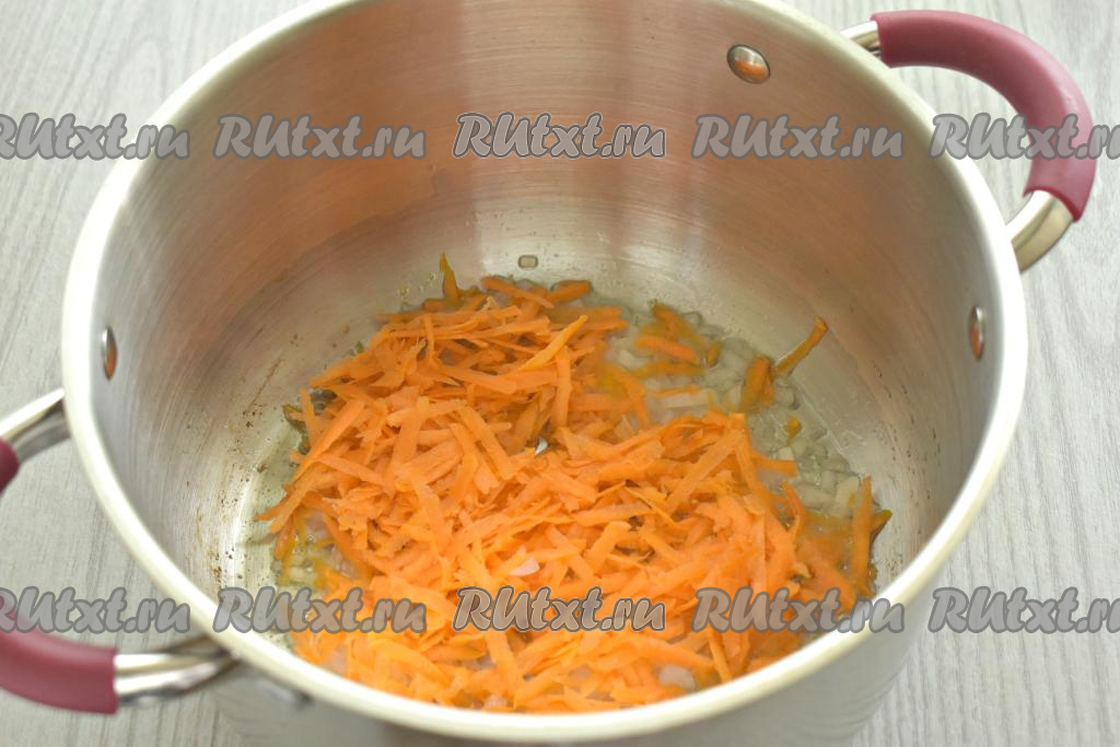 К обжаренному луку добавляем натёртую на крупной тёрке морковку, перемешиваем и обжариваем овощи 4-5 минут, не забывая иногда помешивать.