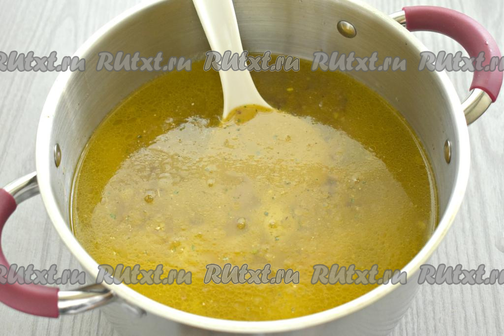Вливаем в кастрюлю 1,5 литра тёплой воды, доводим до кипения, по вкусу солим гречневый суп с фаршем.