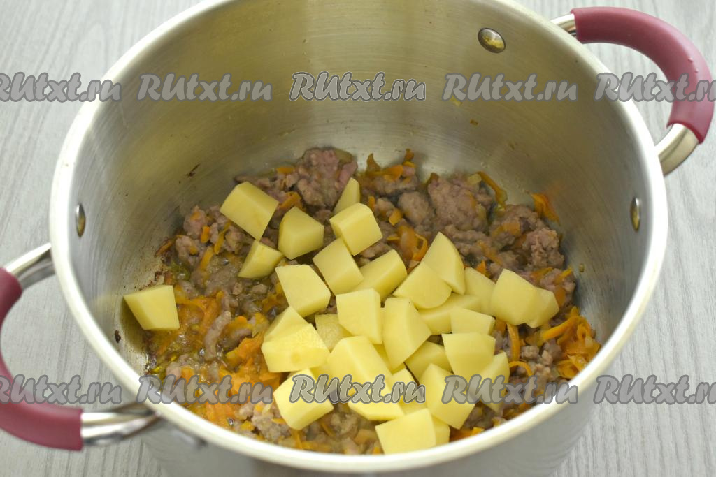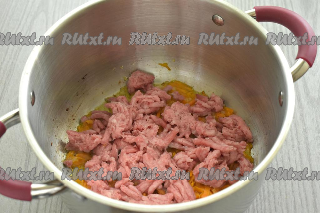 К обжаренным овощам в кастрюлю добавляем фарш, перемешиваем и обжариваем минут 5, постоянно разбивая лопаточкой (или столовой ложкой) кусочки мясного фарша.