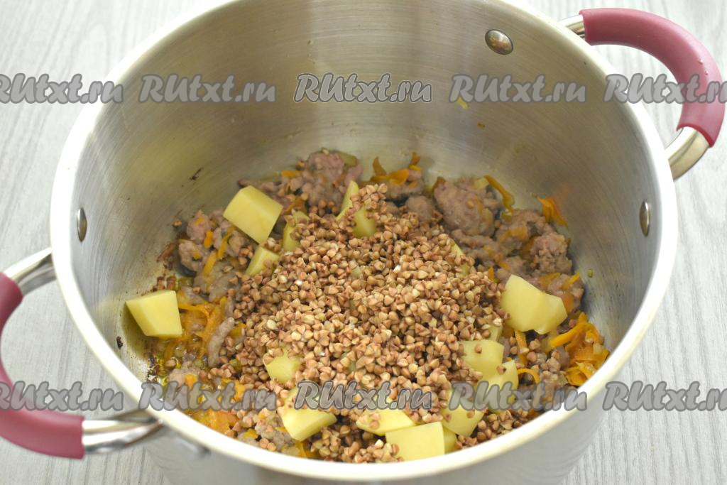 Промываем гречневую крупу, убирая некачественные зёрнышки, лишней воде даём стечь. Сразу за картофелем выкладываем в кастрюлю гречку.