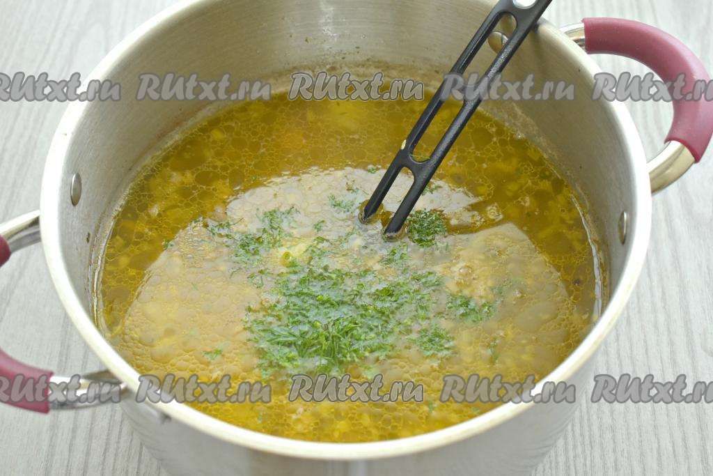 После закипания варим суп на небольшом огне 20 минут. В конце приготовления добавляем в кастрюлю нарезанный укроп, по вкусу перчим, перемешиваем, даём закипеть, провариваем 1 минуту на небольшом огне и выключаем огонь.