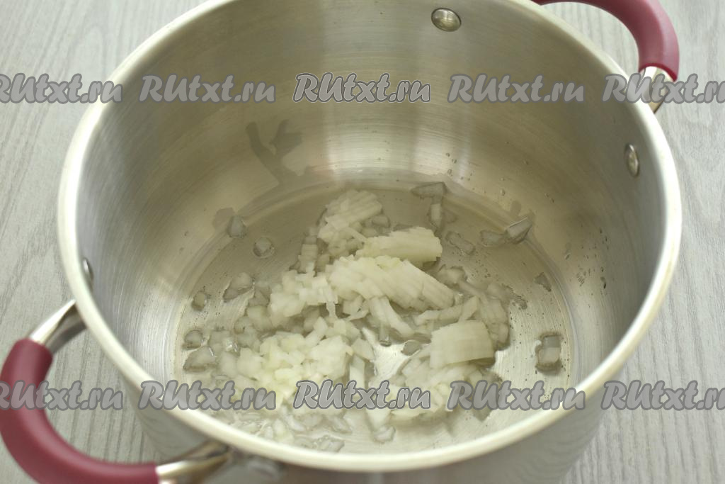 Лук и морковку очищаем. В кастрюлю с толстым дном наливаем растительное масло, разогреваем его, выкладываем лук, нарезанный на мелкие кубики, и обжариваем его на среднем огне минуты 3, периодически помешивая.