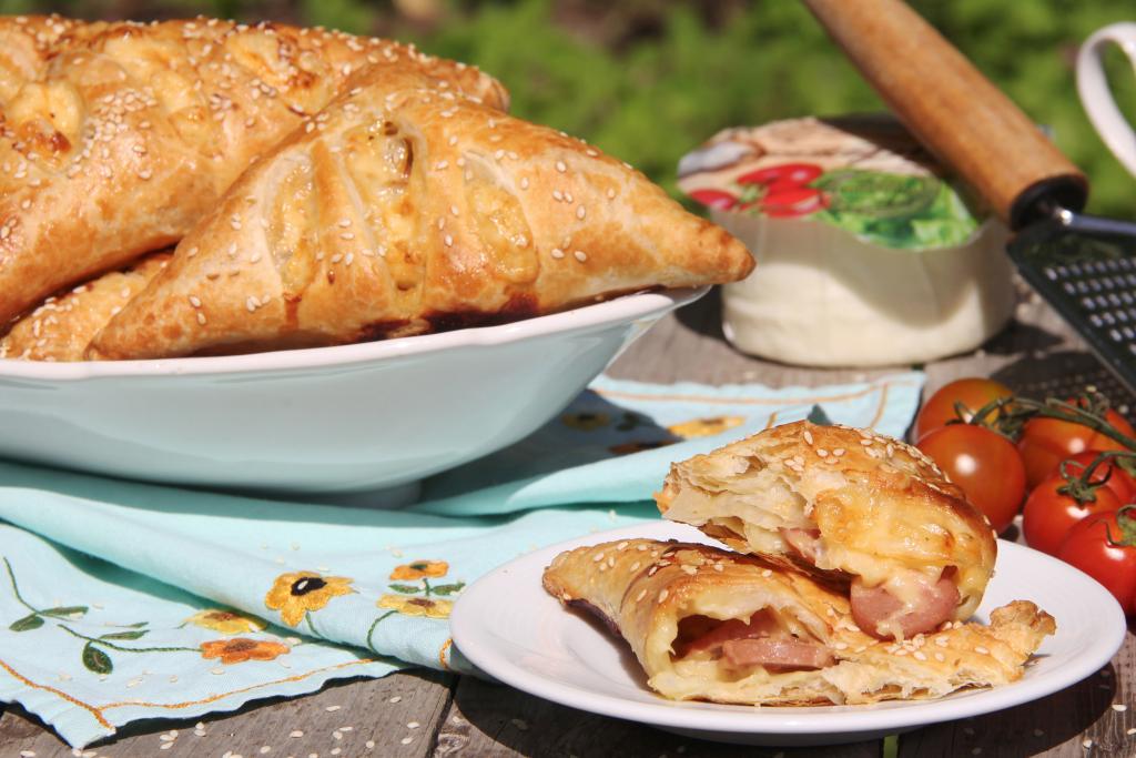 Достать вкусные, аппетитные слоёные пирожки из духовки, переложить на тарелку и подать к столу. Турноверы с сосисками и сыром можно приготовить к чаю, в качестве перекуса или для пикника.
