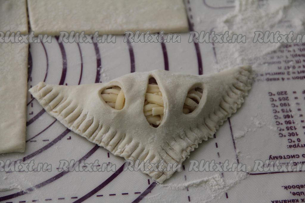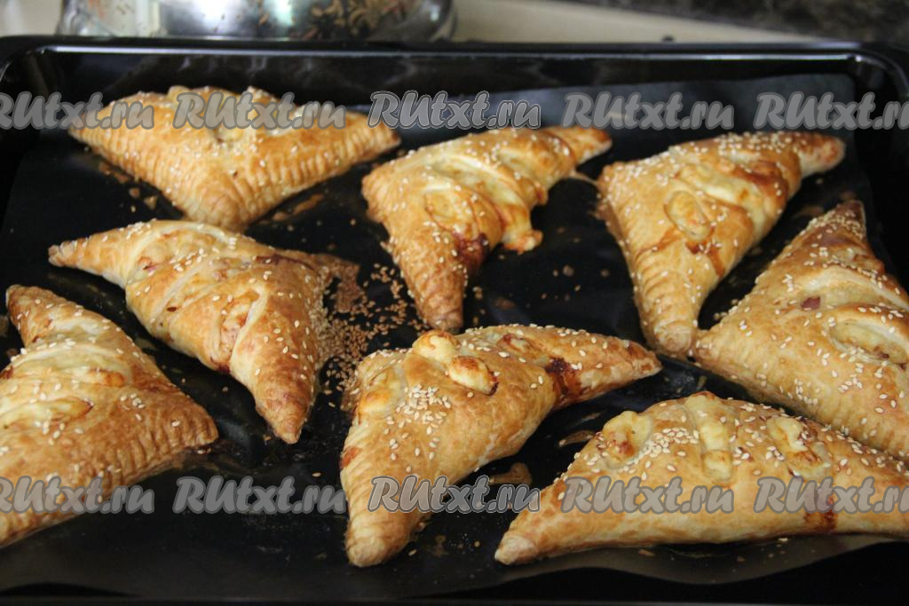 Выпекать турноверы с сосисками и сыром в разогретой до 220 градусов духовке минут 20 (до золотистого цвета слоёного теста).