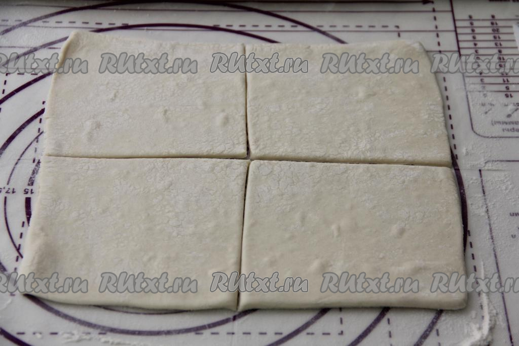 У меня слоёное тесто в двух пластах. Каждый пласт теста раскатать на припылённой мукой поверхности в квадрат толщиной примерно 3 миллиметра и разрезать на 4 квадрата. То есть из двух пластов теста мы будем формировать 8 турноверов.