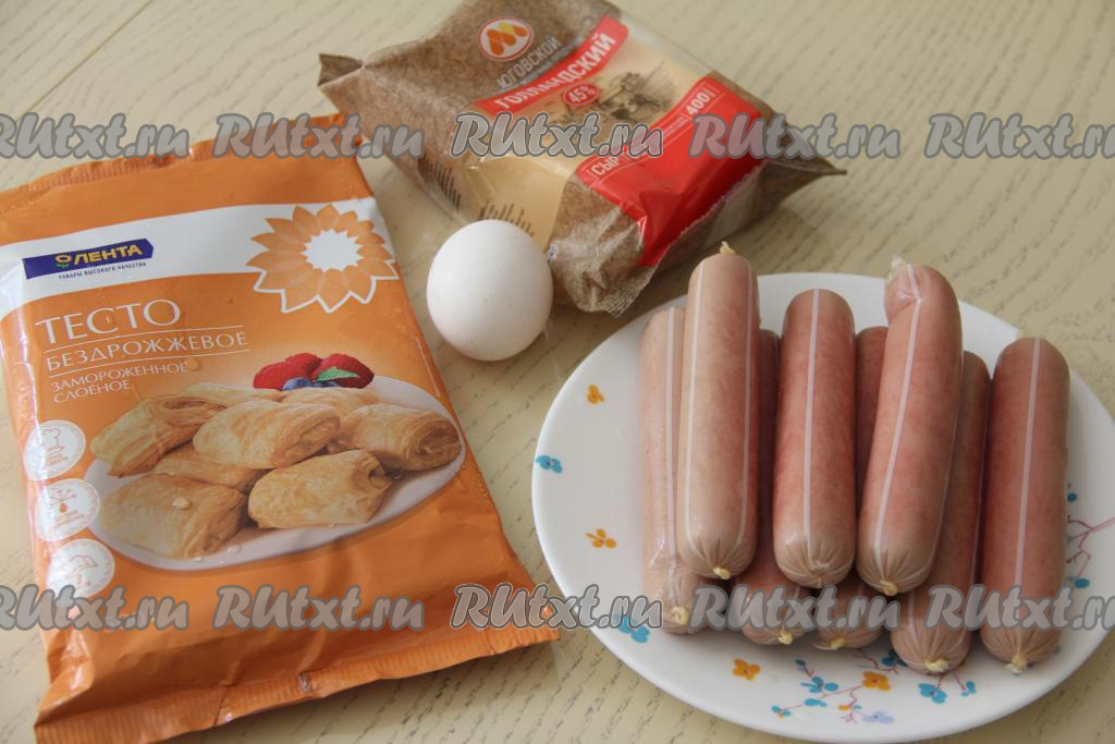 Подготовить продукты. Слоёное тесто для такой выпечки можно использовать как бездрожжевое, так и дрожжевое. В этот раз для формирования турноверов я взяла покупное бездрожжевое слоёное тесто. Заранее разморозить тесто при комнатной температуре. Сосиски очистить от слюды. Сосиски лучше покупать качественные, от проверенного производителя.