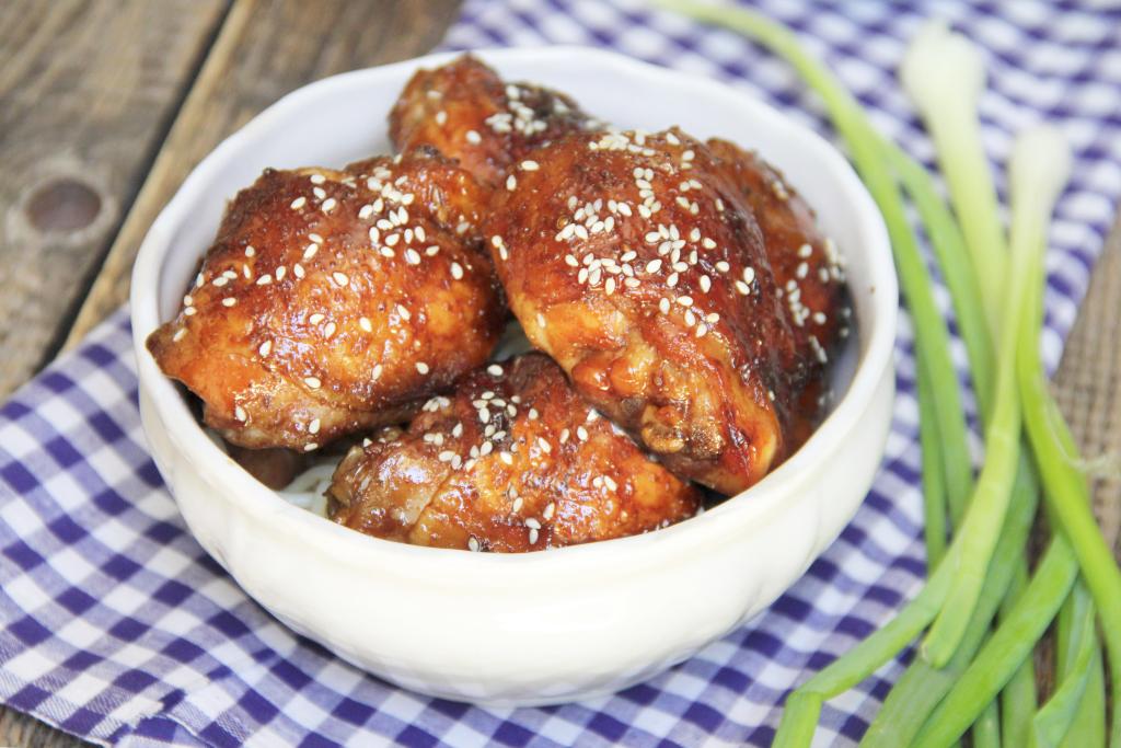 Вкусные, сочные куриные бёдра достать из духовки и с гарниром подать к столу. Благодаря соусу "Терияки", запечённые бёдрышки получаются очень аппетитными!