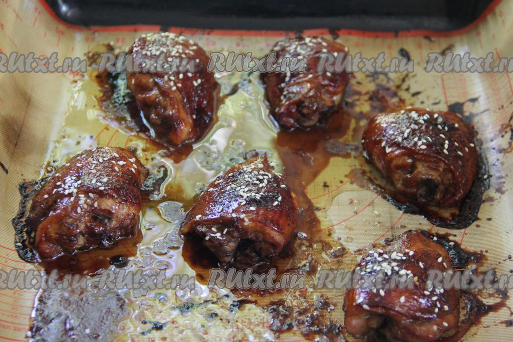 Запекать куриные бёдра в разогретой духовке при температуре 180 градусов 40 минут. Затем достать противень с бёдрышками и с помощью кисточки смазать их смесью соуса "Терияки" и соевого соуса, в которой мариновалось мясо. По желанию присыпать кунжутом. Поставить противень в духовку ещё на 10 минут.