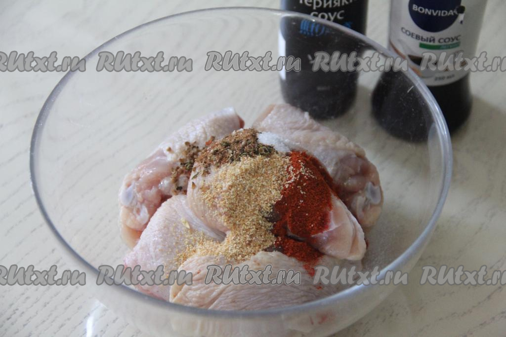 Переложить бёдрышки в миску, добавить соль по вкусу (добавляя соль, учитывайте солёность соевого соуса и соуса "Терияки", в которых в дальнейшем будет мариноваться мясо) и любые специи (я использовала паприку, сушёный чеснок и карри).