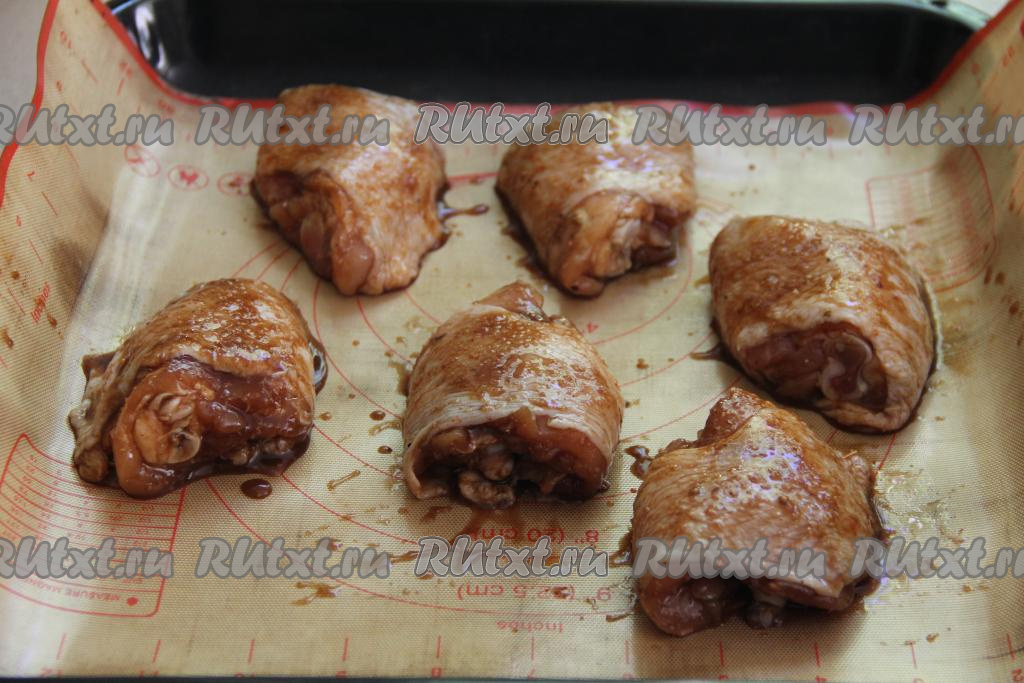 Выложить замаринованные бёдрышки на противень, застеленный тефлоновым ковриком (или пергаментом). Маринад на этом этапе не выливайте, он нам понадобится для смазывания бёдер в процессе запекания.