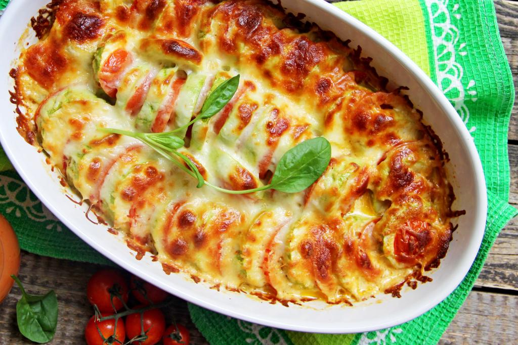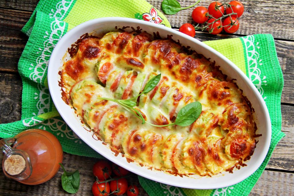 Готовое овощное блюдо достать из духовки. Кабачки, запечённые с помидорами, майонезом и сыром, получаются сочными, аппетитными и вкусными, к столу подавать их лучше в горячем виде.
