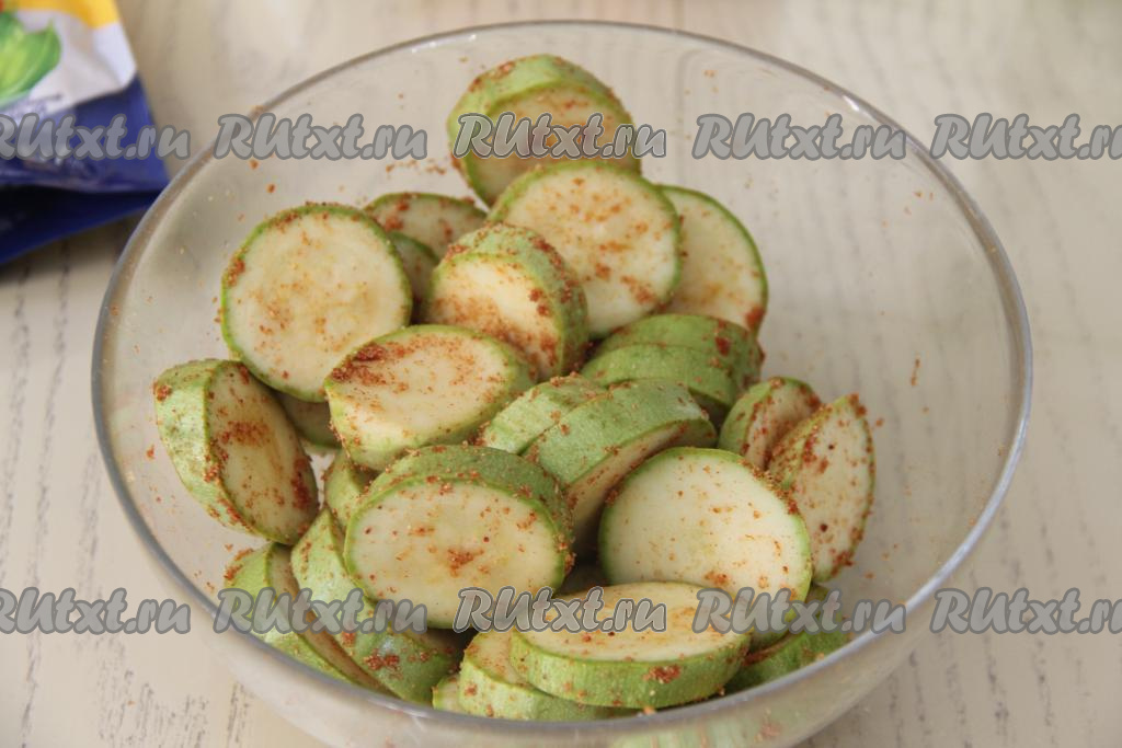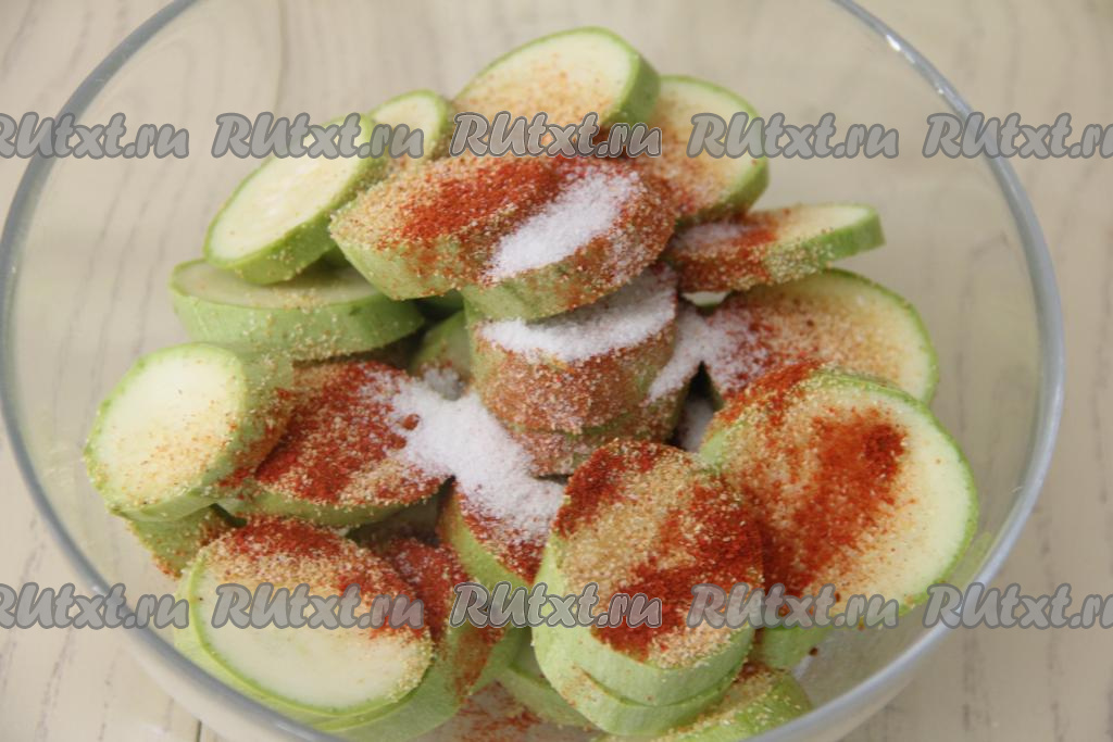 Кабачки нарезать на кружочки толщиной примерно 6-8 миллиметров, выложить в миску, добавить соль и специи (в качестве специй я использовала паприку и сушёный чеснок).
