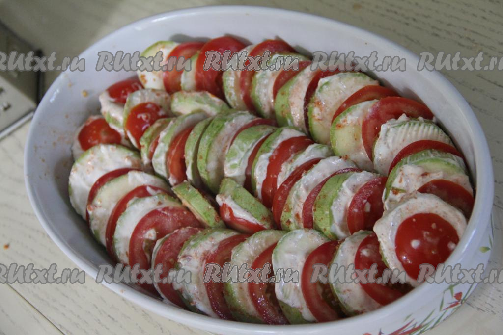 Помидоры нарезать на кружочки. В жаропрочную форму выложить под небольшим наклоном, немного внахлёст, чередуя, кружочки кабачков и помидоров.