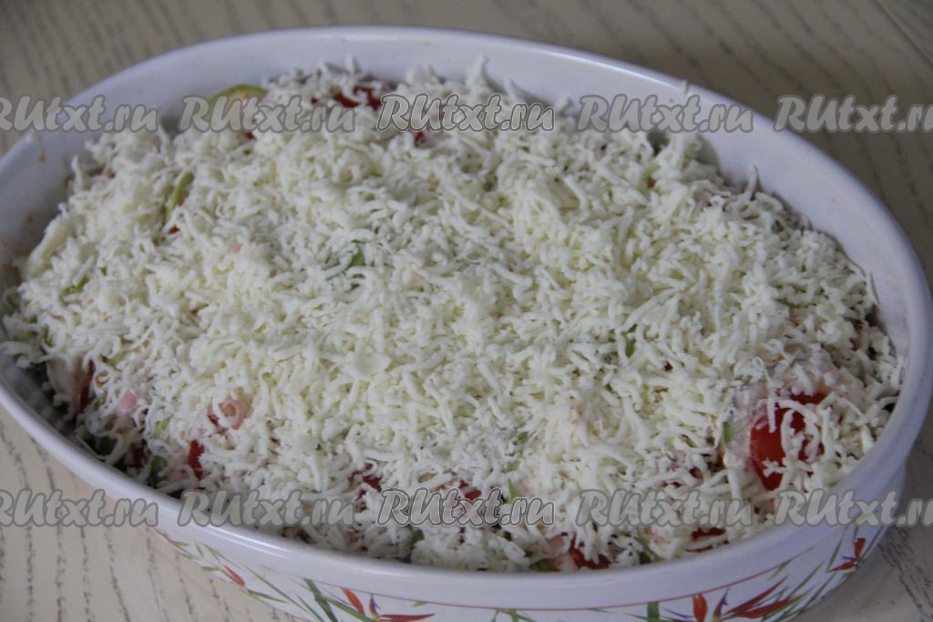 На дно формы с овощами влить немного воды. Присыпать овощи сверху натёртым сыром. Накрыть форму фольгой. Запекать овощи в разогретой до 180 градусов духовке 40-45 минут (кабачки должны стать достаточно мягкими и легко прокалываться вилкой).