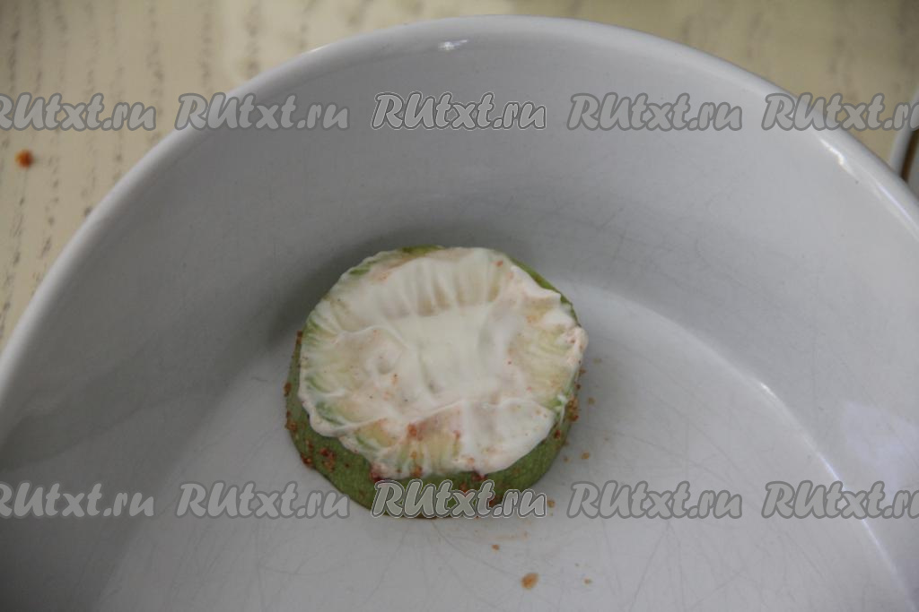 Каждый кружочек кабачка с одной стороны смазать майонезом.