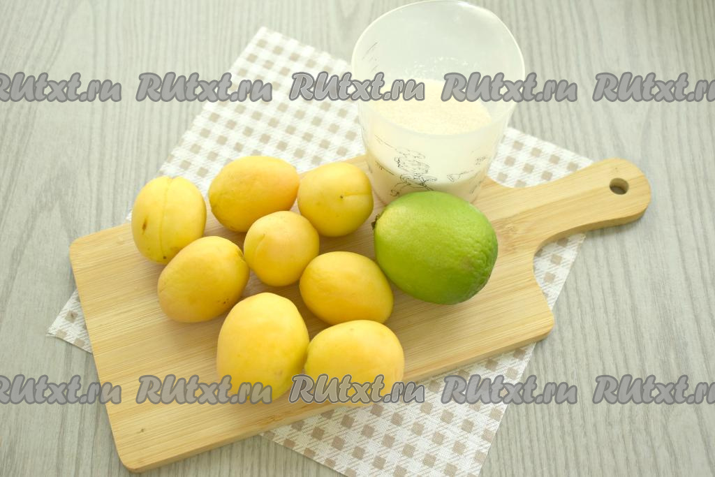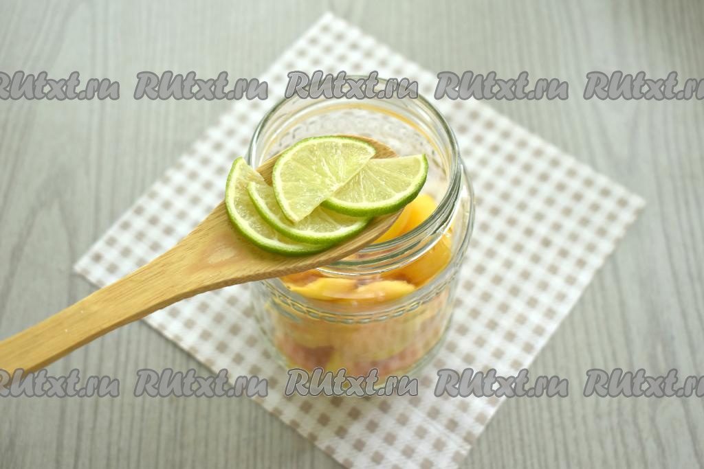 Половинки абрикосов перекладываем в простерилизованную 1-литровую банку. Лимон (или лайм) тщательно моем, отрезаем 2 кружочка, разрезаем их пополам и добавляем в банку с абрикосами.
