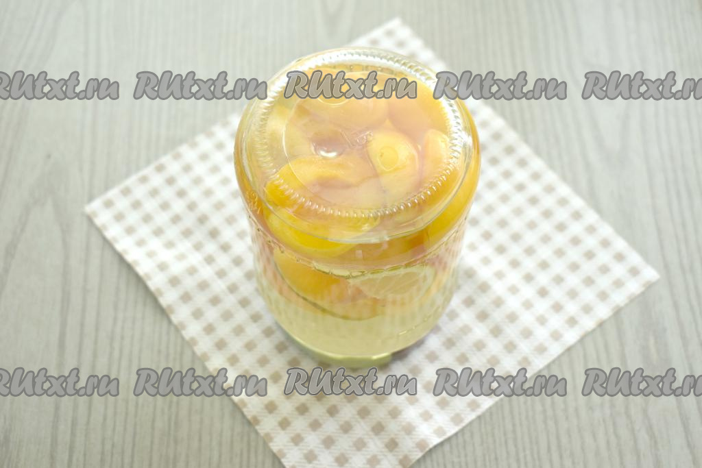 Убираем сироп с огня и вливаем в банку с абрикосами и лимоном. Сразу закручиваем (или закатываем) банку крышкой. Банку кладём на бок и проверяем на герметичность (то есть убеждаемся в том, что сироп не вытекает из закрытой банки). Затем банку с компотом ставим вверх дном, накрываем пледом (или толстым полотенцем), оставляем до полного остывания (примерно на сутки). После полного остывания можно переставлять на хранение в прохладное место.