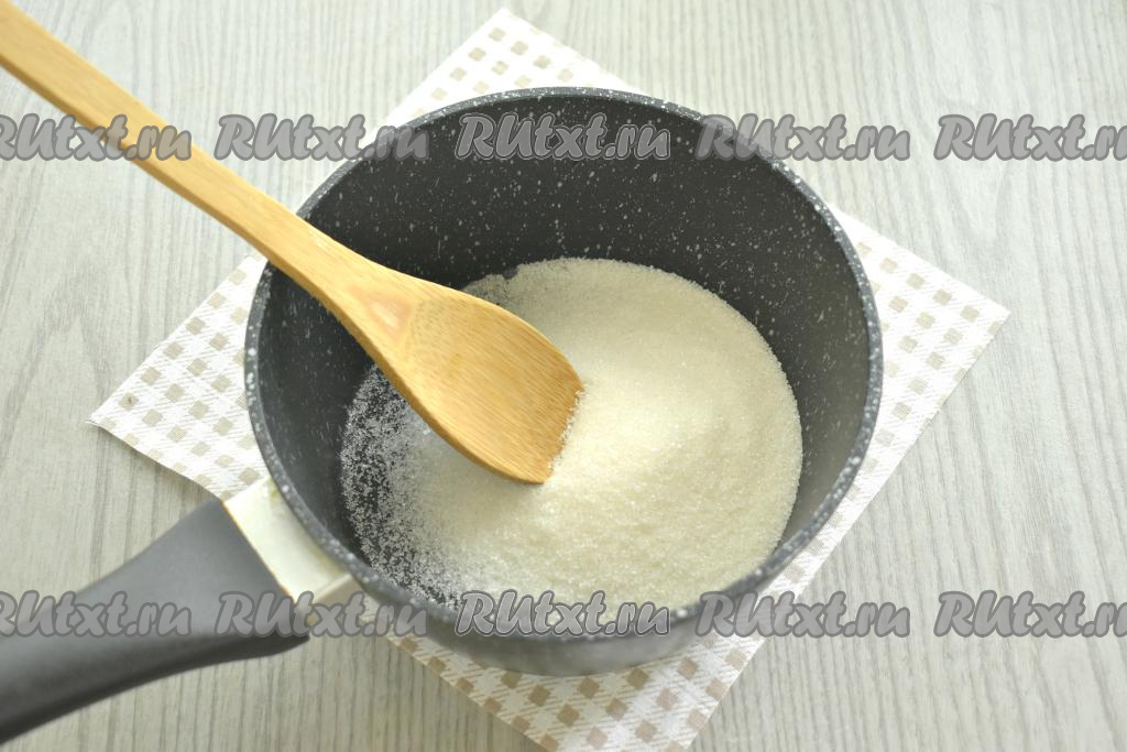 Спустя это время в ковшик (или в небольшую кастрюлю) всыпаем сахар, сюда же аккуратно выливаем воду из банки с абрикосами, перемешиваем и ставим на огонь. После закипания варим сироп на небольшом огне 1-2 минуты (до растворения сахара).