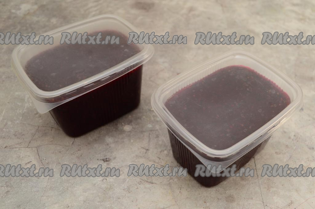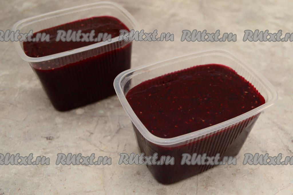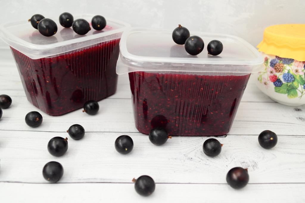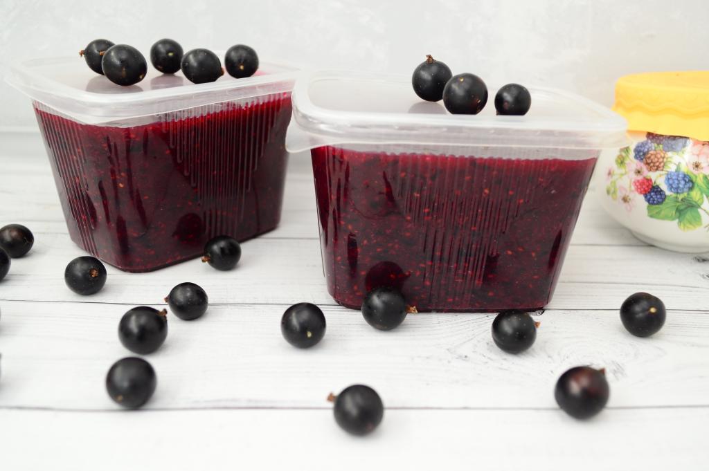 По прошествии 15-20 минут пюре из чёрной смородины, смешанной с сахаром, снова перемешать и разлить по пластиковым контейнерам.
