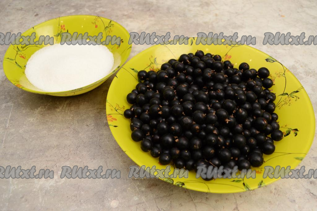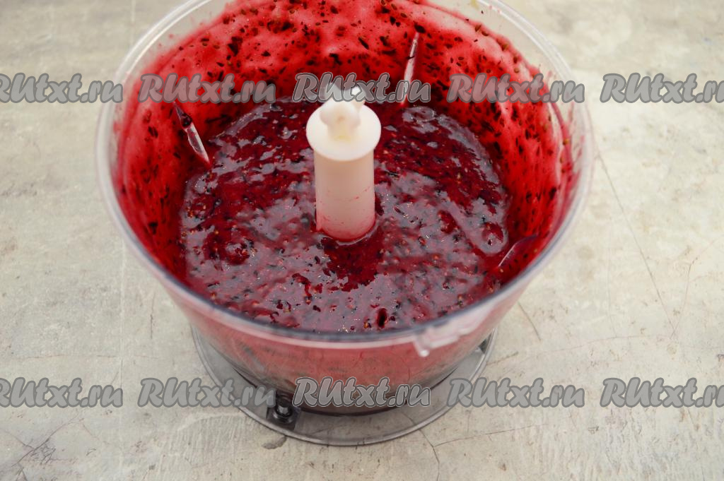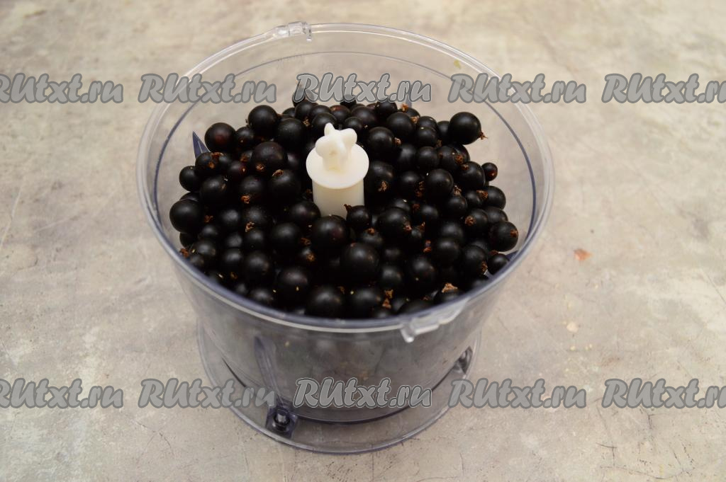 Пробить чёрную смородину в измельчителе до получения пюре. Если нет измельчителя, можно пробить смородину погружным блендером.