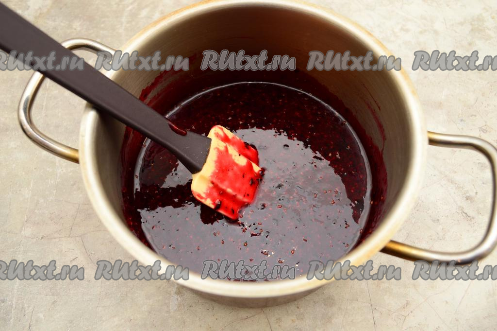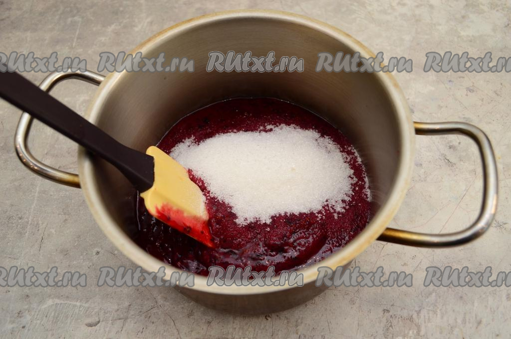 Перелить пюре из чёрной смородины в кастрюлю, всыпать сахар.