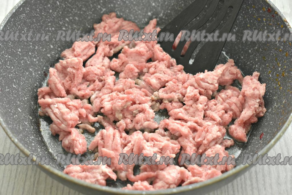 Одновременно на сковороду, в которой жарились овощи для борща, доливаем 1 столовую ложку масла, выкладываем мясной фарш, обжариваем фарш, постоянно разбивая кусочки мяса лопаткой, 5-7 минут (до изменения цвета фарша со всех сторон).