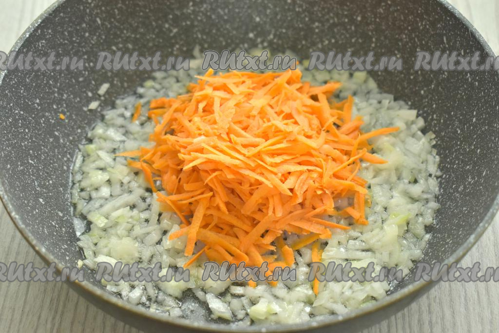 Пока варятся капуста с картошкой, обжарим овощи. Для этого разогреваем в сковороде растительное масло, уменьшаем огонь до среднего, выкладываем мелко нарезанный лук, обжариваем его, иногда помешивая, до прозрачности (минуты 3). Затем добавляем натёртую на крупной тёрке морковку, перемешиваем овощи и обжариваем, не забывая иногда перемешивать, минут 5 (до прозрачности моркови).