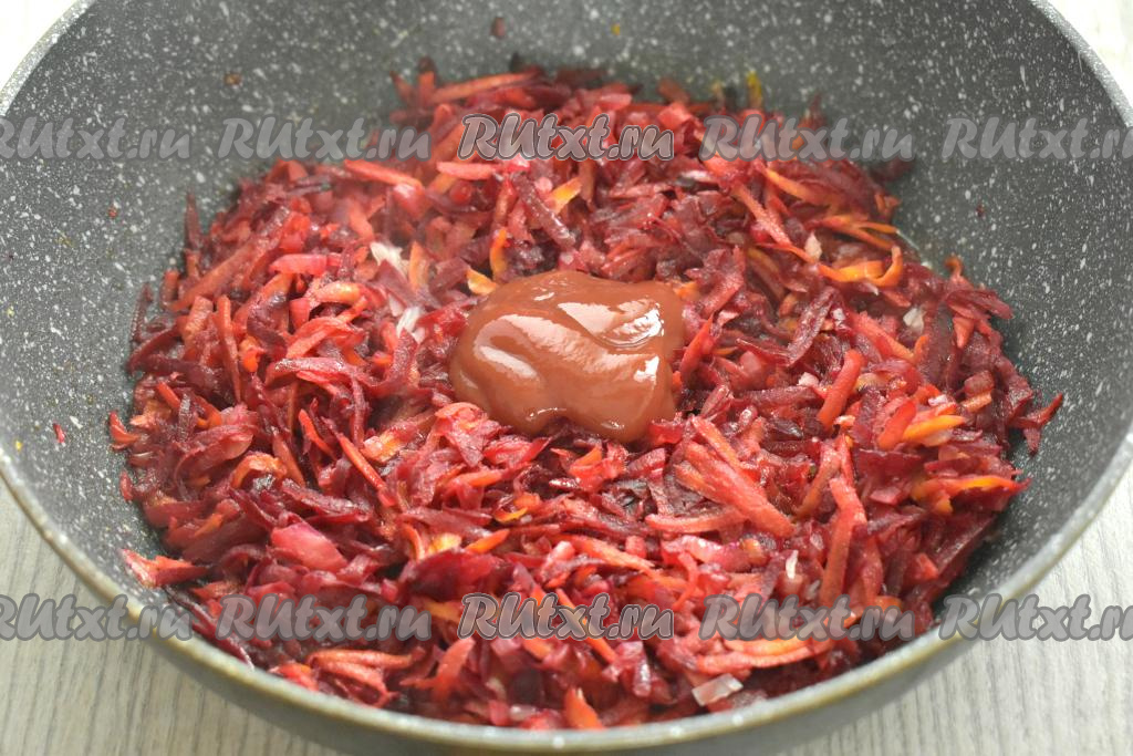 Спустя это время к овощам добавляем томатный соус, вливаем 5-6 столовых ложек овощного бульона из кастрюли, перемешиваем, даём бульону закипеть и тушим овощи под крышкой на небольшом огне 5-10 минут (до мягкости свеклы).