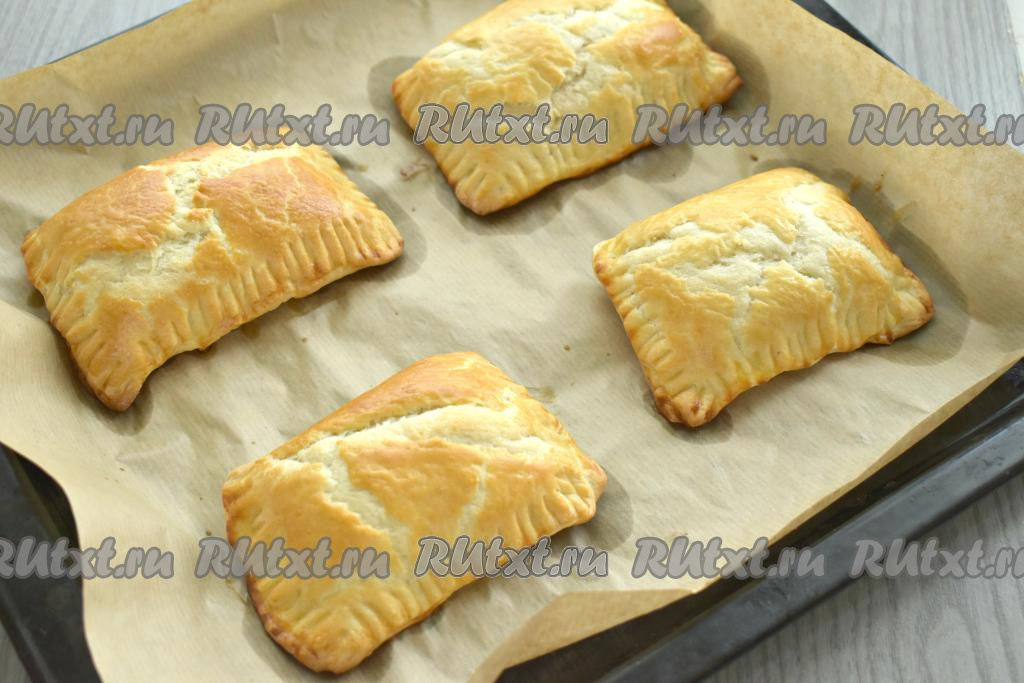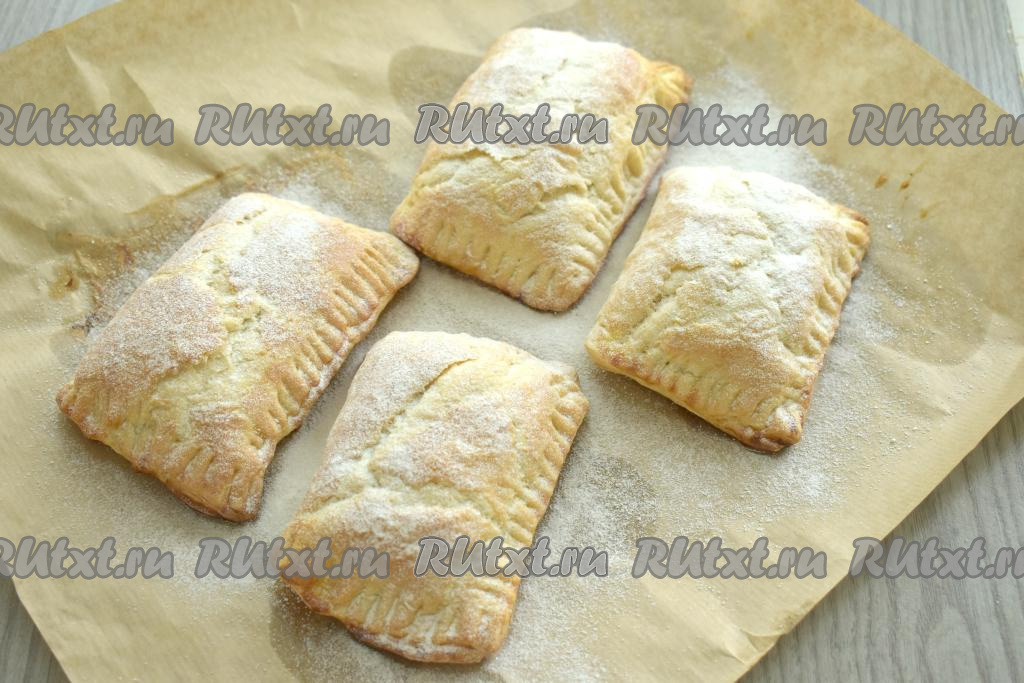 Достаём готовые слойки из духовки, даём им остыть, после этого, по желанию, посыпаем сахарной пудрой.