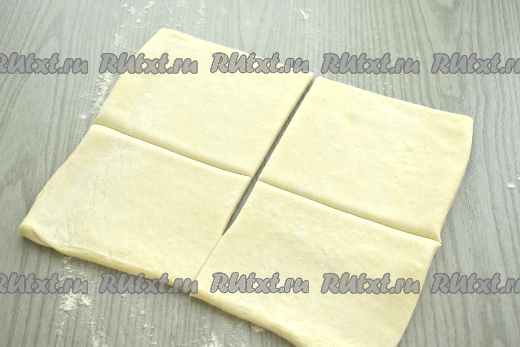 Получившийся пласт слоёного теста разрезаем на 4 прямоугольных заготовки.