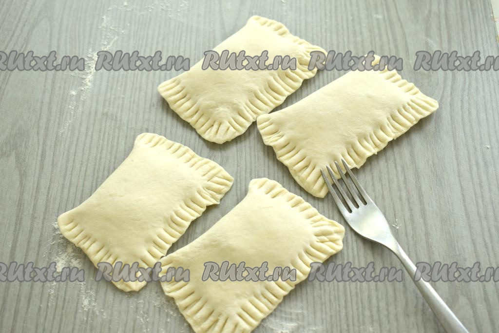 Сторону прямоугольника с варёной сгущёнкой накрываем свободной стороной прямоугольника. Скрепляем края слоек, тщательно прижимая края с помощью вилки. Если вилка будет сильно липнуть к слоёному тесту, тогда периодически окунайте её в муку.